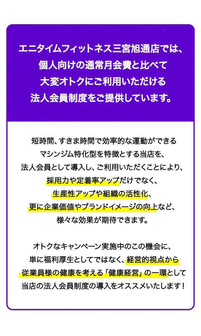 はい、ご利用いただけます。ただし、一定期間内に契約店舗以外の利用頻度が多くなると、 所属店が変更(移籍)となります。この場合、法人会員サービスの割引適用外となるため、 注意して頂く必要がございます。移籍制度については担当から詳しく案内をさせて頂きます。